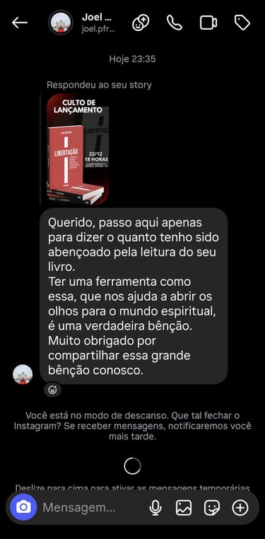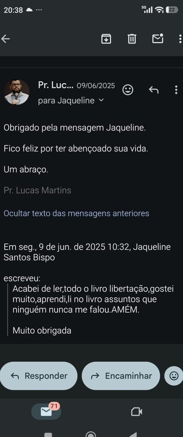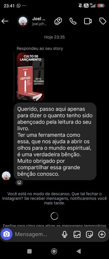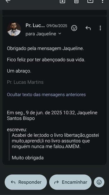 Movido pelo chamado de levar o Evangelho além das fronteiras, o pastor Lucas Martins esteve em Angola, na África, ministrando evangelismo e cultos de libertação.Em uma terra assolada por forte opressão espiritual, cada oração era um confronto, e cada vida liberta confirmava uma verdade: Deus o estava chamando para a linha de frente da batalha espiritual. Mais do que uma viagem missionária, foi um comissionamento. Ali, o Senhor selou em seu coração a autoridade para lutar pela libertação de vidas. Ao retornar, esse mover alcançou sua própria casa, quando seu pai foi liberto do vício em álcool — um testemunho de que Deus começa no lar aquilo que expande às nações. Essa vivência deu origem ao livro Libertação, uma mensagem que continua rompendo cadeias, restaurando famílias e conduzindo pessoas à verdadeira liberdade em Cristo.